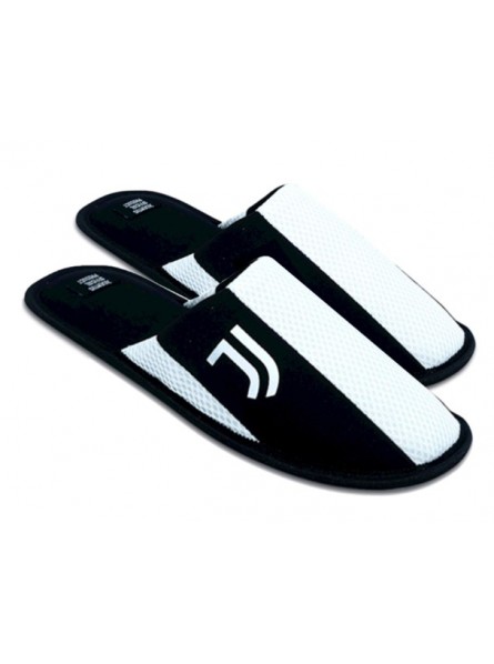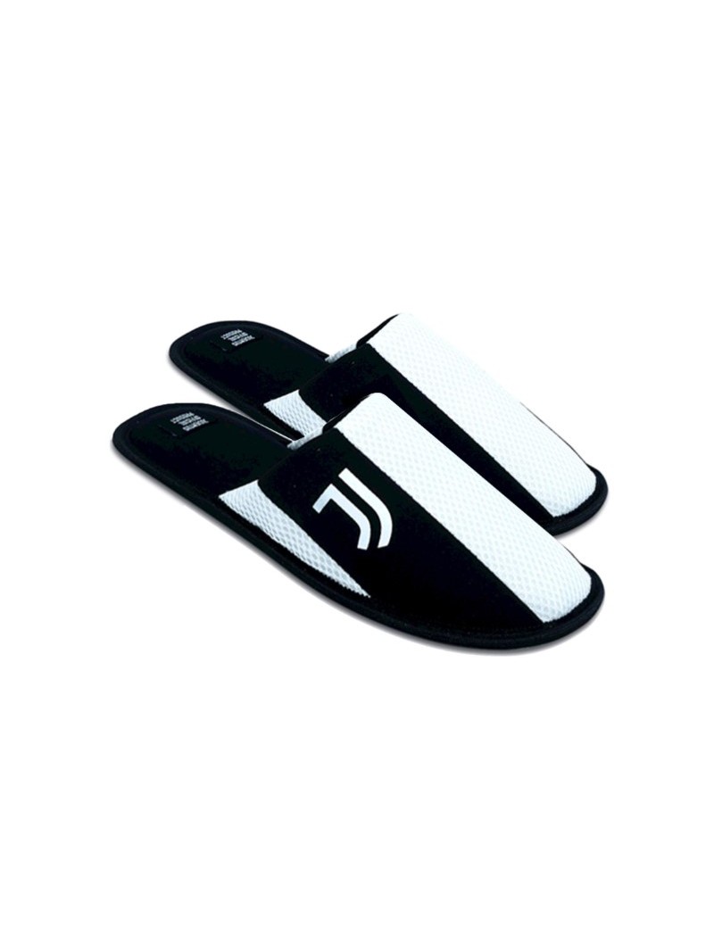 JUVE PANTOFOLE CASA DA ADULTO, COLORE BIANCONERO CON LOGO UFFICIALE JUVENTUS FC STAMPATO IN BIANCO SU FONDO NERO.
