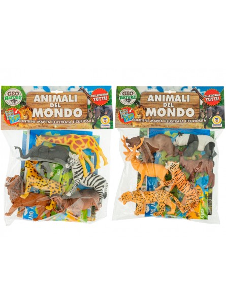 Busta con all'interno 12 animali del mondo: giraffa, elefante, zebra, tigre, leone e tanti altri. Sono inclusi poi una mappa con disegnati tutti gli animali nei rispettivi continenti e una card con curiosità e informazioni sugli animali.