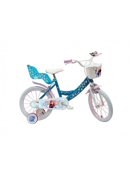 La bicicletta Frozen ha un telaio in metallo con dettagli e personalizzazioni del mondo Frozen ed è accessoriata con cestino anteriore e seggiolino portabambola posteriore.