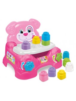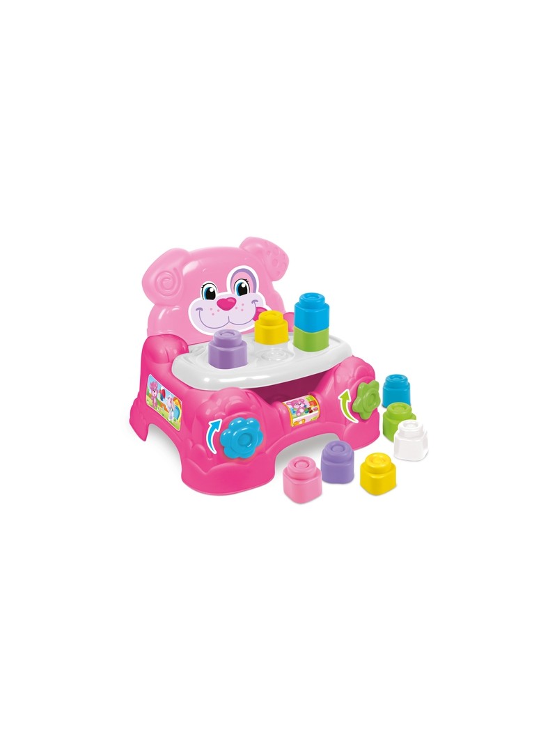 La seduta, divertente base di gioco, è solida e accogliente e nasconde un pratico vano contenitore per i mattoncini.