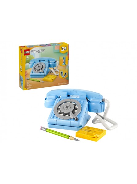 Adulti nostalgici e bambini creativi dagli 8 anni in su possono tornare indietro nel tempo con questo elegante set da costruzione Telefono retrò LEGO® Creator 3 in 1 (31174). Contiene un telefono retrò degli anni ’60 con ricevitore sollevabile, cavo flessibile, disco di selezione e funzione a molla per quando i chiamanti riagganciano. Il set decorativo retrò contiene anche una matita in mattoncini e un blocco note adesivo personalizzabile con una scelta di 3 tessere con messaggi diversi. Questo fantastico set LEGO offre 3 diverse opzioni di costruzione con gli stessi mattoncini: un telefono giocattolo retrò degli anni ’60, un telefono giocattolo degli anni ’80 su una base di ricarica o 2 telefoni degli anni 2000. I set LEGO Creator 3 in 1 sono fantastici regali per i bambini e presentano 3 diverse opzioni di costruzione in ogni scatola. Questi set giocattolo ricostruibili 3 in 1 consentono ai bambini di divertirsi con il gioco di fantasia e offrono un’avvincente gamma che si rivolgealle loro passioni più grandi. I modelli non possono essere costruiti contemporaneamente. Il set contiene 383 pezzi.