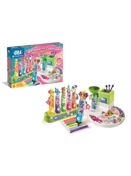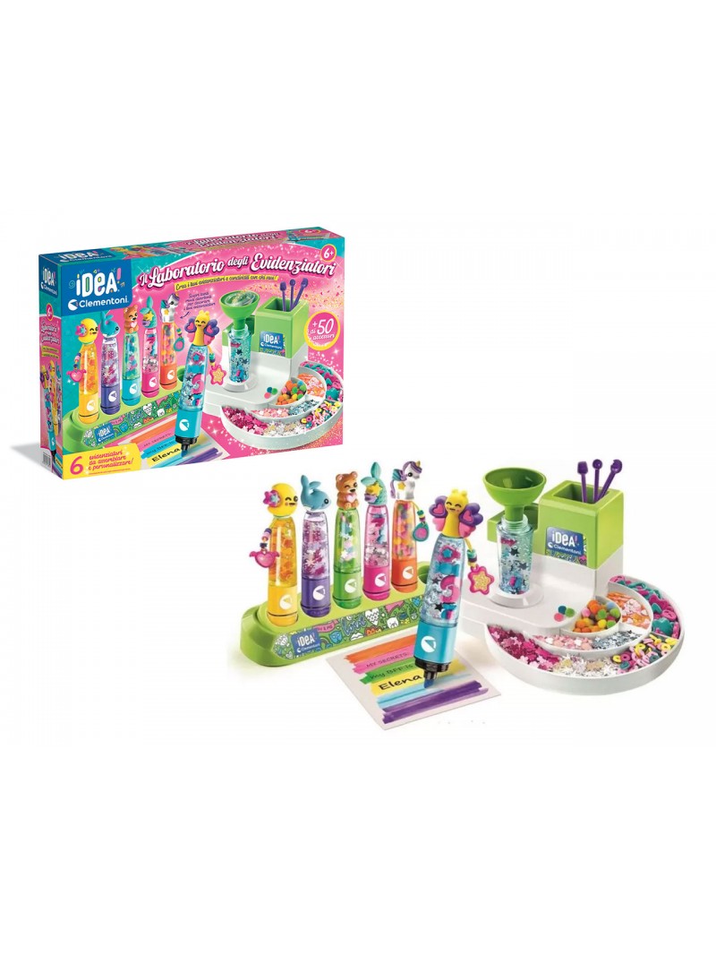 Un creativo ed originale laboratorio che permette di assemblare dei simpaticissimi evidenziatori Un pratico e ricco kit composto da filtri, punte, inchiostri, personaggi e tutti gli strumenti per realizzare gli evidenziatori Il gioco è molto facile: immergi il filtro nell'inchiostro, inseriscilo in una base, aggiungi la punta e chiudi tutto con il tappo Il nuovo gioco Idea consente di creare e personalizzare i propri evidenziatori con tanti accessori e colorazioni Un concetto che va oltre la semplice attività di personalizzare il proprio evidenziatore. Si può creare dando sfogo alla fantasia.