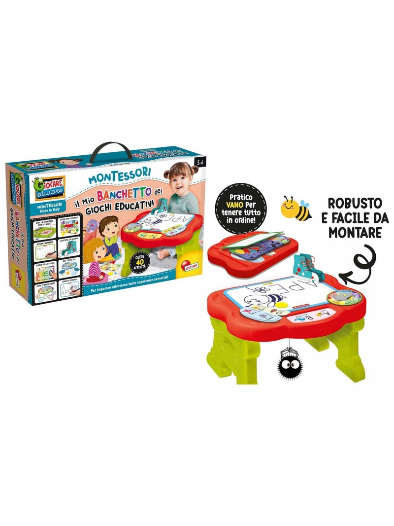 Questo set educativo, basato sul metodo Montessori, offre una varietà di attività per stimolare l'apprendimento dei bambini. Include un robusto tavolino con una lavagna scrivi e cancella, tessere dell’alfabeto, un pennarello scrivi e cancella, una scarpa da montare per esercitare la motricità fine, un cancellino, una base per ragnatela con trampolino, due ragni, un cordoncino, schede delle forme, formine di cartone e una maxi scheda arcobaleno. Questo set è progettato per favorire lo sviluppo delle competenze cognitive e motorie in modo divertente e interattivo, incoraggiando l'autonomia e la creatività dei bambini.