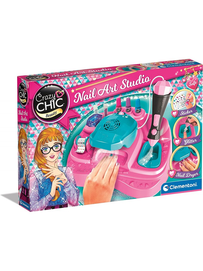 CONTENUTO DEL GIOCO: Il kit unghie contiene banchetto con macchina asciuga smalto e penna spara glitter, gli smalti Crazy Chic, adesivi per unghie e polvere glitter colorata per decorazioni super Glam!