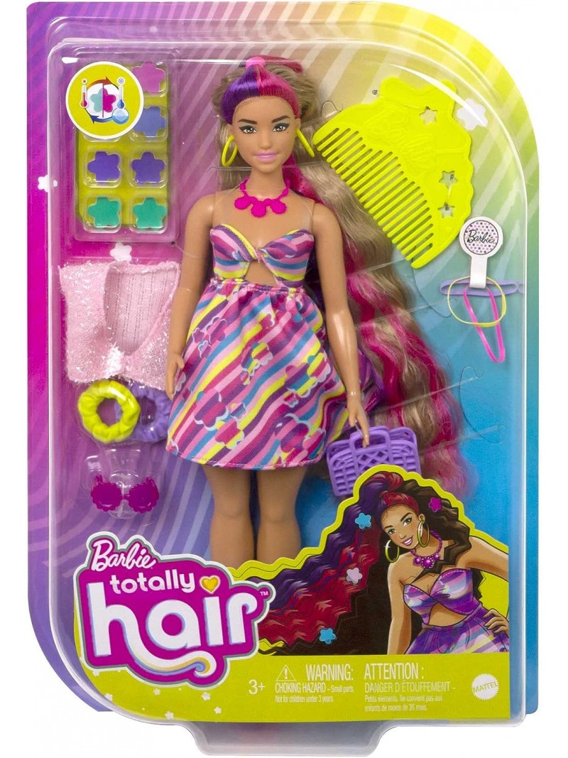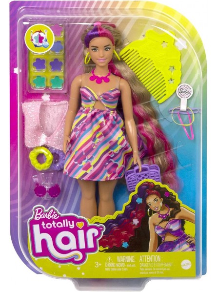 Barbie sfoggia capelli lunghissimi fino a 21,6 cm e oltre 15 accessori aggiuntivi: 8 fermagli per capelli cambia colore, pettine, 1 set di elastici per capelli, 2 elastici in tessuto, un maglione corto metallizzato, una borsetta, occhiali da sole e una collana.