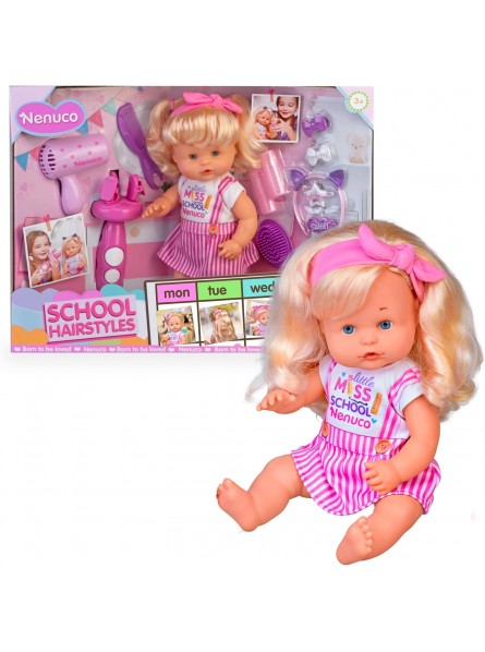 Nenuco School Hairstyle è una bambola di 35 cm con corpo rigido e lunghi capelli biondi, perfetti per essere acconciati. I bambini possono creare nuove acconciature per Nenuco, una diversa per ogni giorno di scuola