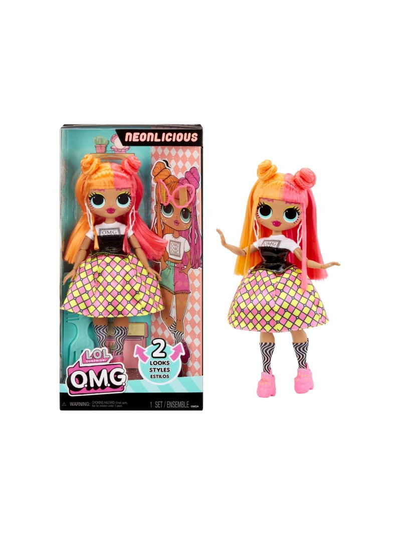 Le originali bambole alla moda l.o.l. surprise o.m.g. sono tornate in una nuova veste glamour e con bellissime acconciature: saluta neonlicious, la sorella maggiore del personaggio elettrico neon q.t.! neonlicious è una stilista che ama la moda e i colori vivaci, le luci brillanti e l'energia! scopri le numerose sorprese, tra cui la trasformazione degli abiti e i favolosi accessori, dagli occhiali da sole ai simpatici orecchini che mostrano il suo stile unico e colorato! vesti neonlicious con la sua camicia omg unica nel suo genere, il corsetto alla moda e la splendida gonna a scacchi! scopri l'ulteriore sorpresa alla moda di neonlicious togliendo la gonna per rivelare i pantaloncini colorati bicolore, trasformando istantaneamente il suo outfit in un look completamente diverso! questa riedizione di neonlicious mette in mostra i suoi splendidi lineamenti, lacconciatura, il suo accattivante outfit e linfinità di pose che può assumere.ogni confezione include una bambola fashion l.o.l. s urprise o.m.g., abiti audaci, accessori, scarpe e un pettine per capelli! colleziona tutte le 4 bambole l.o.l. surprise o.m.g. nella nuova versione: swag, neonlicious, lady diva e royal bee!