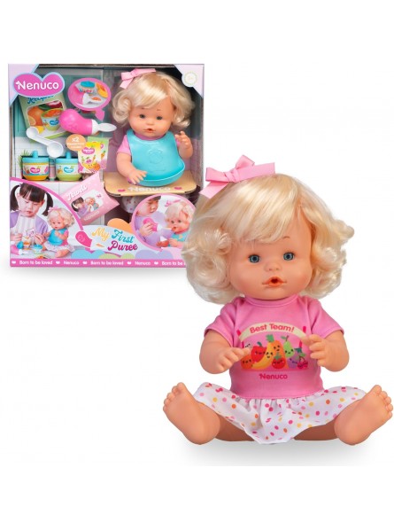Nenuco misura 35 cm con un corpo rigido. I capelli biondi e ricci e il vestitino rosa la rendono la compagna ideale per i più piccoli