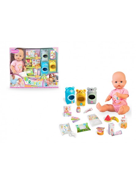 Con Nenuco Cura e Ricicla avrai tutti gli accessori necessari per nutrire, cambiare il pannolino e curare le ferite del tuo Nenuco come se fosse un vero bambino. Ma il gioco non finisce qui! Ciascuno degli accessori può essere separato in modo da poterlo classificare in ciascuno dei 3 contenitori per il riciclaggio. Nenuco è un bambino di 42 cm dal corpo sodo che indossa un bellissimo body rosa.
