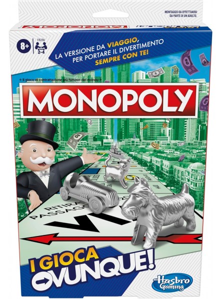 VERSIONE PORTATILE DEL GIOCO MONOPOLY: la stessa giocabilità classica in un formato compatto! Il gioco Monopoly, I Gioca Ovunque dagli 8 anni in su è una versione mini e portatile del gioco da tavolo Monopoly per divertirsi in viaggio