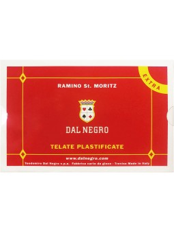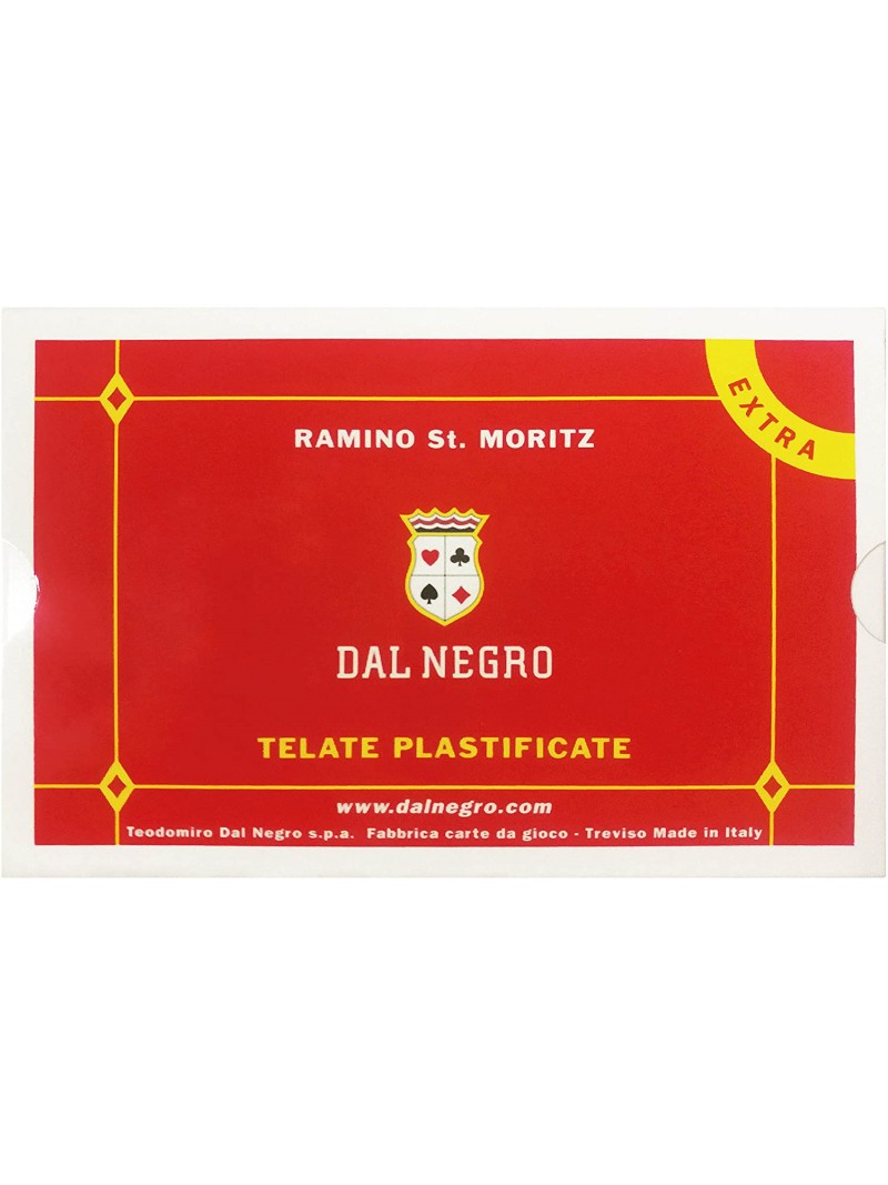 L'astuccio Ramino St. Moritz Dal Negro include due mazzi di carte da poker retro in cartoncino extra. Carte telate e plastificate, formato carte da gioco mm 63x88, retro rosso/blu.