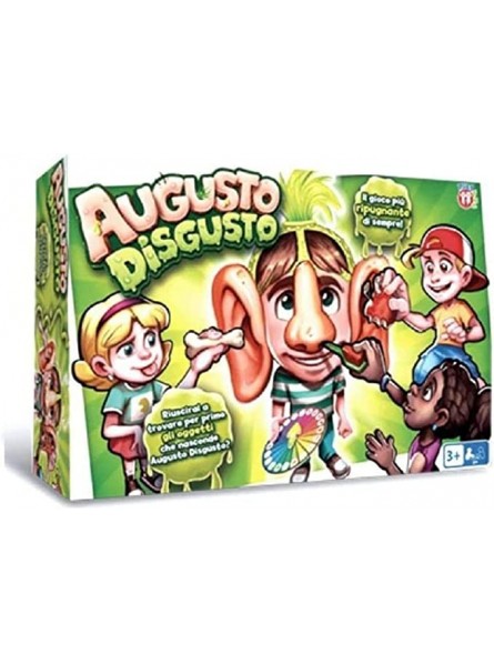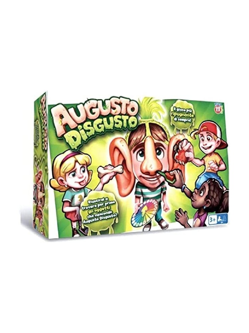 Augusto Disgusto è un divertentissimo gioco per bambini dai 3 anni in su!Mentre un giocatore indossa il divertente testone e diventa Augusto, gli altri dovranno cercare nelle suo orecchie e narici degli animaletti.Che disgusto Augusto!Sarà la ruota a dire quale animaletto cercare ad ogni turno. Vince il primo che ne trova 3!