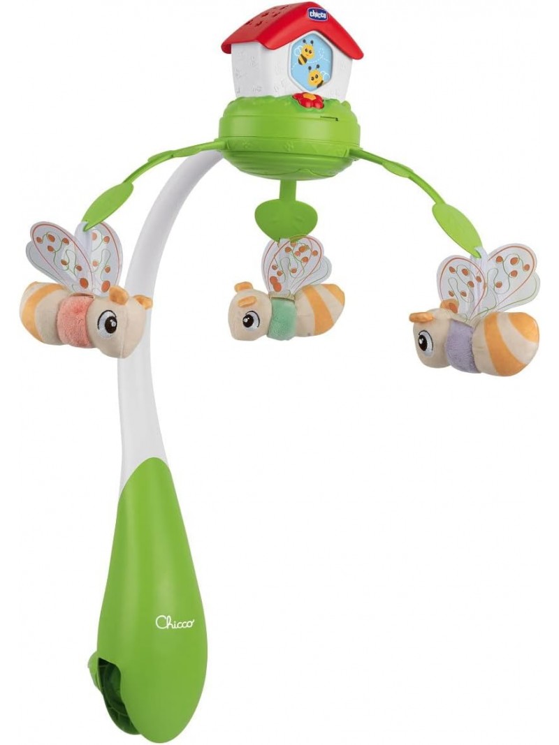GIOSTRINA ELETTRONICA: Una nuova versione della Casina delle Api Chicco, amata da generazioni di bambini. Con proiezione, luci soffuse e tanta musica per riempire la stanza di colori e melodie rilassanti accompagnando il bambino nei momenti di riposo