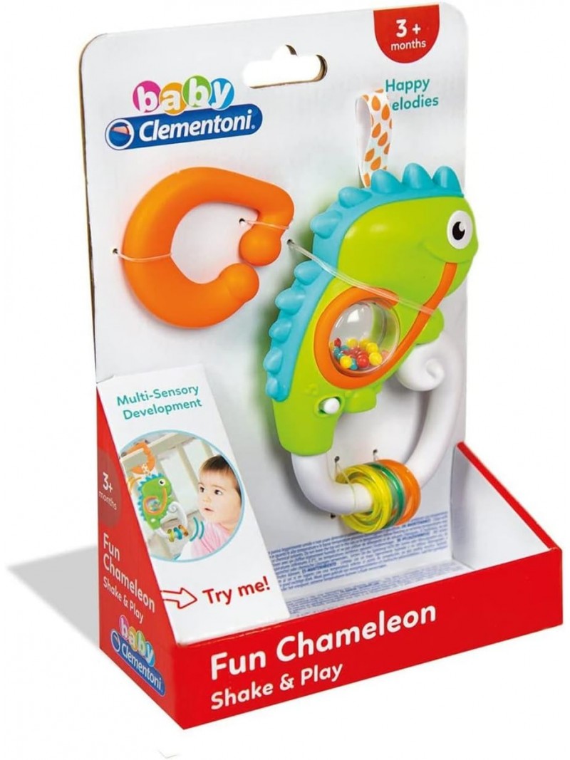 Muovendolo il sonaglino attiva allegre melodie ed effetti sonori, mentre le palline nella pancia del camaleonte e i ciondoli colorati attirano l'attenzione del bambino stimolando la percezione tattile.