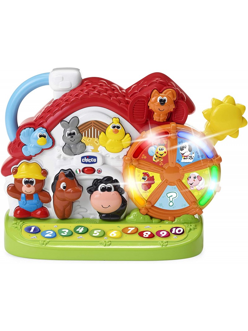 Insegna in italiano e in inglese: 10 nomi e versi degli animali della fattoria, 4 curiosità sugli animali, i numeri da 1 a 10, colori e simpatiche canzoni a tema fattoria