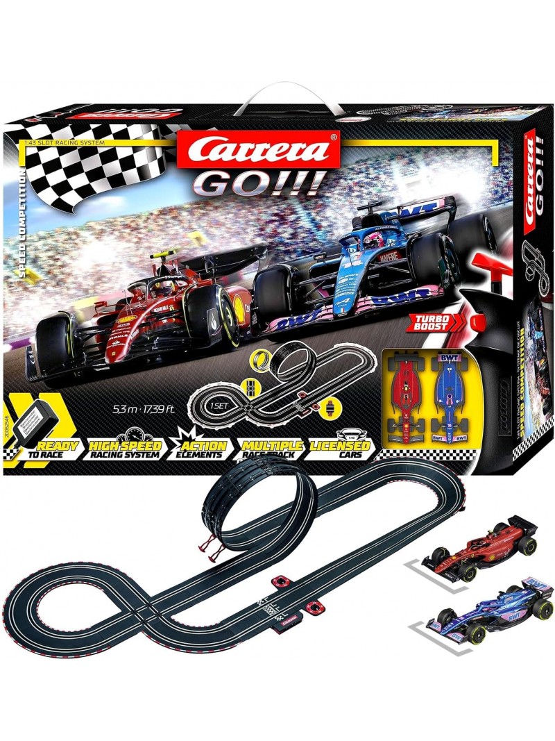 Contenuto della confezione: F1 Alpine 2022 "Alonso, No.14" F1 Ferrari 2022 "Sainz, No.55" Trasformatore, pista di collegamento, controller a 2 velocità, contagiri, pista di raccordo, rettilinei, curve, loop, guardrail, supporti